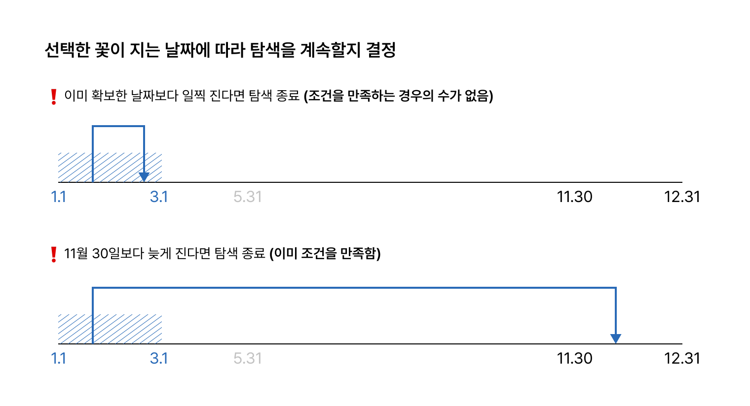 - 만약 선택한 꽃의 지는 날짜가 3월 1일 이전이라면 다음 날짜를 확보할 수 없으므로 탐색을 종료합니다.