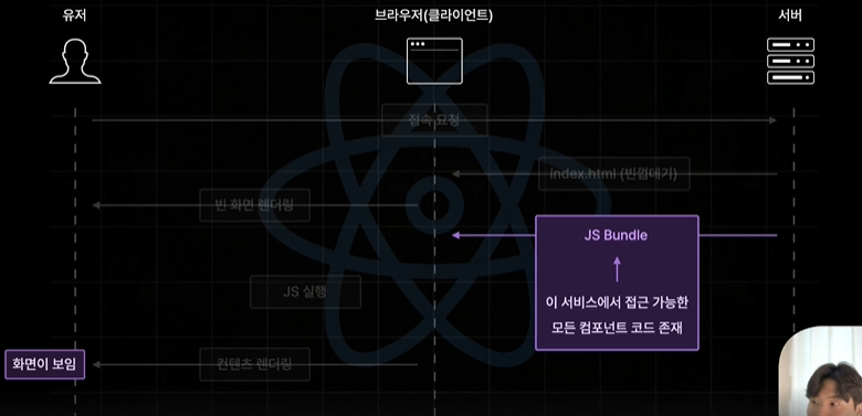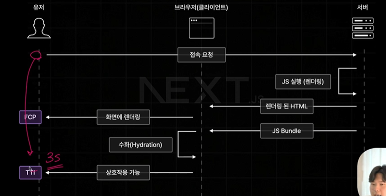 - 브라우저가 후속으로 JS Bundle을 받으면 JS 실행해서 HTML 요소와 연결하면 이 떄부터 상호작용 가능해짐